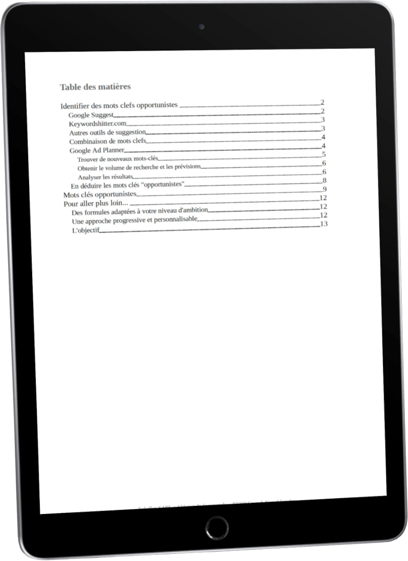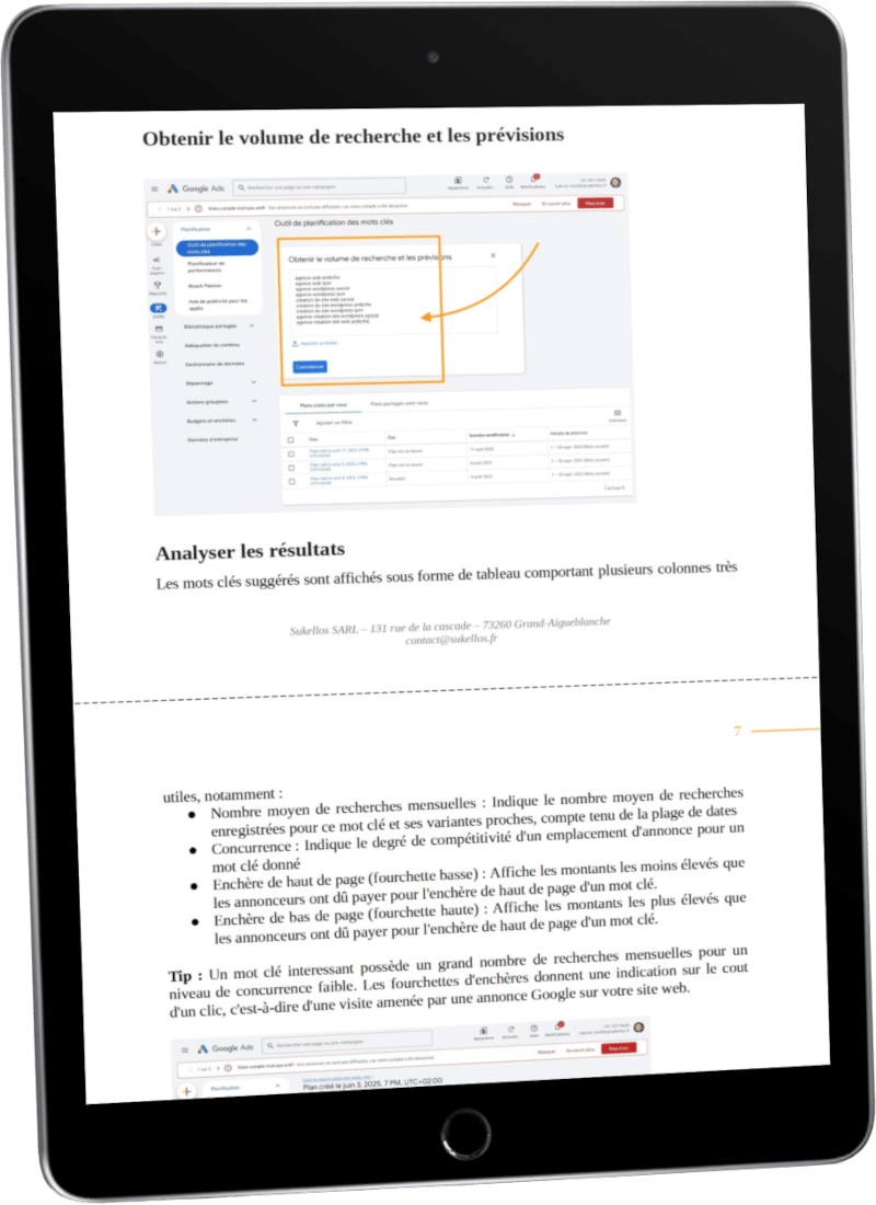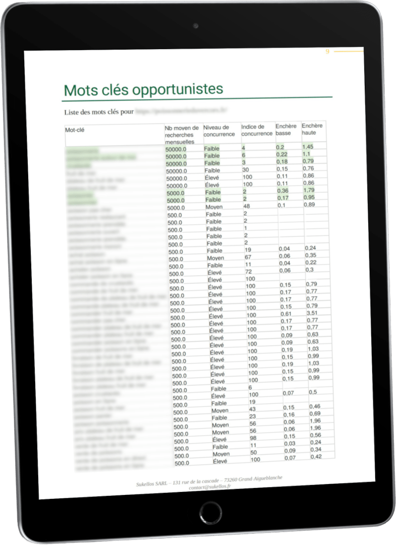 Vous recevez un rapport contenant une liste structurée de mots-clés recherchés, avec volumes, niveaux de concurrence, sélection pertinente, recommandations, ainsi que la méthode pour pouvoir l’effectuer vous-même par le suite.